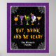 This fun and spooky party sign features Halloween themed cocktails with decorations such as a witch's hat, broomstick and cauldron, ghost, bat, pumpkins and eyeballs. In the background is a black and purple damask pattern with spider webs. The text combines decorative and serif fonts for a stylish and modern look. This is perfect for a Halloween fancy dress costume party.