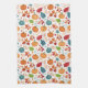 Halloween Colourful Pumpkins and Leaves kitchen towel with red, orange, brown, and blue colours.