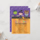 Purple stars pattern on the top background, orange stripes on the bottom and a Frankenstein, witch and werewolf characters illustrate this cool Halloween party invitation. It reads "you're invited to a Halloween costume party".