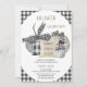 Halloween costume party invitation. Rustic farmhouse design with country pumpkins, buffalo plaid, porch pillows, spooky pumpkin with creepy crawly spider and ribbon bows.