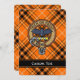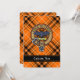 Halloween crest badge with flying bat surrounded by a strap and buckle over tartan background. Custom text.