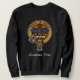 Halloween crest badge with flying bat surrounded by a strap and buckle over tartan background. Custom text.