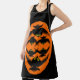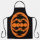 This awesome apron features an orange oval with six crows in it. Each crow has yellow eyes with black pupils and outstretched wings. The crows are flying towards each other forming an oval shape. The background is black.