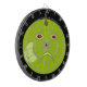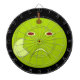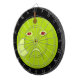 This awesome dart board design features a cartoon of an evil apple with red eyes and a scowl on its face. The apple has a scar on its cheek where someone has peeled it. This has made the apple very angry and it has set off into the black night to seek revenge.