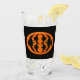 This awesome glass tumbler features an orange oval with six crows in it. Each crow has yellow eyes with black pupils and outstretched wings. The crows are flying towards each other forming an oval shape. The background is black.