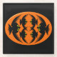 This awesome glass coaster features an orange oval with six crows in it. Each crow has yellow eyes with black pupils and outstretched wings. The crows are flying towards each other forming an oval shape. The background is black.