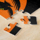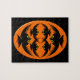 This awesome puzzle Halloween design features an orange oval with six crows in it. Each crow has yellow eyes with black pupils and outstretched wings. The crows are flying towards each other forming an oval shape. The background is black.