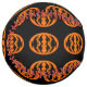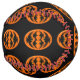 This awesome softball features an orange oval with six crows in it. Each crow has yellow eyes with black pupils and outstretched wings. The crows are flying towards each other forming an oval shape. The background is black.
