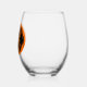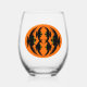 This awesome stemless wine glass features an orange oval with six crows in it. Each crow has yellow eyes with black pupils and outstretched wings. The crows are flying towards each other forming an oval shape.
