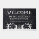 Black and white spooky Halloween welcome doormat with the text "Welcome to the (family name) haunted house, enter at your own risk". This front door mat rug features a haunted house door, scary trees with faces, cats, bats, a cemetery with tombstones, and a spiderweb background.