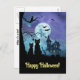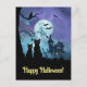 A cute Happy Halloween postcard of spooky black cats, bats, owl and a haunted house.