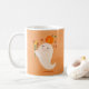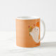 A cute little ghost smiles happily as it floats across a sherbet orange background, holding a bouquet of fall blooms as a beguiling jack-o'-lantern balances atop the ghost's head. Original illustration by Noël Snow
