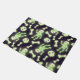 Drawings of a cute spooky skeleton, bones, and skulls that look like greenish glow in the dark color on a dark purple black background and purple space stars in their eyes. They are arranged in a non-directional all-over halloween pattern. Please note this print does not actually glow in the dark, it's just artwork that I made to resemble glow in the dark.