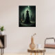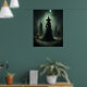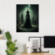 This art print features a solitary witch, silhouetted against a misty, enchanted forest under the glow of a full moon. Her flowing robes and pointed hat evoke the essence of gothic fantasy, while the shadowy towers in the background add to the atmospheric allure of the scene.
