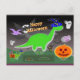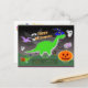 Spooky Dinosaur Happy Halloween Cut & Glue PaperCraft Postcard. Make your own unique Halloween cartoon dinosaur with orange pumpkin stautue with this great 3d cut out and glue card! A cute green Diplodocus dino with a blue wizard hat with yellow stars and a big orange pumpkin and a clouded dark sky with full moon and flying bats, purple flying Pteradonon dino and spooks and a haunted house front text "Happy Halloween". Easy to make, just cut and glue and your green dino paper stand is ready to put in your window, desk or on your bedroom dresser! This spooky Halloween papercraft card is fully customisable, add your texts and images! A very special and unique Halloween handout card!
