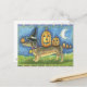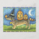Graphic design of a dachshund puppy wearing a pointed hat and with 2 carved pumpkins on his back.and pumpkins on his tail and nose. Very colourful.