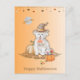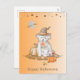 A cute Halloween card with a dog wearing a hat and bow tie with a bucket of Halloween candy.