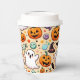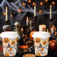 Halloween ghosts, jack-o-lanterns, witches hats and candy on an orange background.