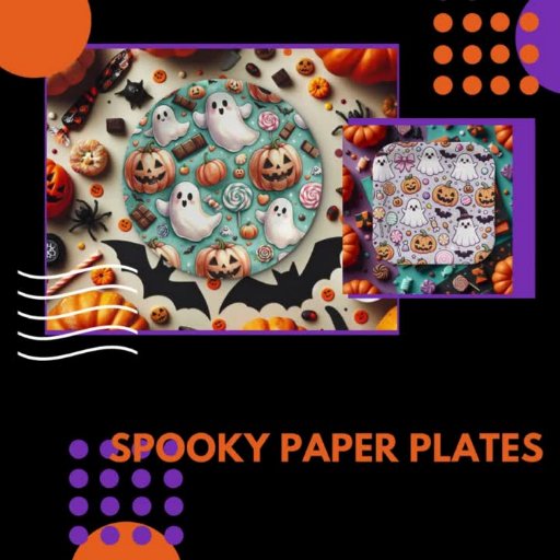 Halloween ghosts, jack-o-lanterns, bats and candy on a purple background.