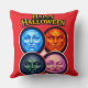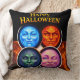 Transform your home for the spooky season with this happy Halloween elemental square throw pillow this stunning design features the four mystical moon faces the serene blue fiery orange enigmatic green and winking pink representing the powerful spirits of the night set against a dramatic backdrop of swirling flames and bold vintage style lettering this high detailed illustration brings a sense of dark fantasy and magical charm to any sofa or be perfect for sale and celebrations or fans of Gothic home decor. This soft and durable cushion is a must have seasonal accent.