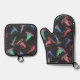 Halloween themed, colourful, enchanted flying witch hats on a starry black background oven mitt & pot holder set.