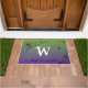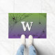Spooky spiderwebs and spiders adorn this mat. Background is a purple to green gradient. Large, white with black shadow, single initial monogram in the centre in a spidery font. At the bottom it reads, "enter if you dare." Fun for trick-or-treaters at your door this Halloween!