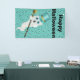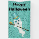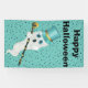 This cloth event or holiday decoration banner is a blue green colour covered in little black stars with a white fancy ghost wearing a blue top hat with gold ribbon holding a black cane topped with a golden skull. Customise the Happy Halloween text with the template.