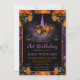 Elegant Watercolor Orange, Purple and Black Halloween Floral Unicorn face design with orange and black flowers and dark purple and bokeh moons background.
