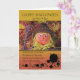 Paper Halloween greeting card for a mum and dad. Photograph of cute folk art scarecrow with knitted hat and broom. Mums fill in the background behind the scarecrow. Silhouette of a pumpkin on the vine and a fall / autumn poem at the bottom. Art, image, and verse copyright © Shoaff Ballanger Studios.