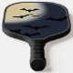 Pickleball Paddle with Halloween Full Moon With Bats artwork design image by TheFabricSeal at Zazzle.com is a illustration drawing with bat eyes looking out for friends and prey alike and a cool dark Halloween night of adventure, goblins, ghouls, and trick or treat sweets. The nightly flight flying black bats are out in force for their fright night Halloween flight. Amazing glowing concentric circular gradient auroral rings around the full moon with colours of creamy yellow and white toned harvest moon glow, deep dark blue and black night sky plus the jet black colours of the flying bats. This image design was incorporated into two cool looking abstract repeating pattern versions