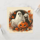 Here's a vintage looking Halloween illustration of a ghost with a jack-o'-lantern and black cat. This retro looking card shows the ghost against background of leaves in fall colours. It's a a cute card with a retro look and is great Halloween card and is perfect for spooky season greetings, invitations or to accompany a gift.