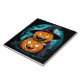 A playful ghost peeks from behind two grinning pumpkins, illuminated by a full moon, surrounded by spooky trees and flying bats, capturing the spirit of Halloween.