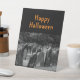 Tabletop party sign features black and white photo of graveyard tombstones with customisable Happy Halloween text on black background makes the perfect Halloween greeting!
