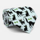 Halloween black cats tie. A pattern of black cats with green eyes is printed over a very pale grey-blue colour. Three cats are sitting, standing, and hissing, along with two green eyes alone, make up this fun holiday design.