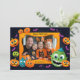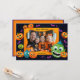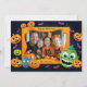 This Halloween greeting card features a central photo space surrounded by a playful and lighthearted Halloween theme. The border around the photo is filled with cartoon-style pumpkins and various funny monsters, each with their own quirky personalities. The pumpkins have wide, goofy grins, and the monsters range from silly ghosts with friendly expressions to cute, colourful creatures with exaggerated features. Purple bats flutter around the edges, adding to the whimsical atmosphere.