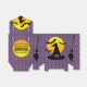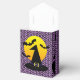 Start your Halloween party with a fun and colourful favour box. This favour box features a purple background with black circles. The two side panels have a witches broom. One the front of the box there is a golden orange moon, with the silhouettes of three bats. The back of the box has the orange moon and text that read "Trick or Treat Goodies" This text can be customised.