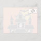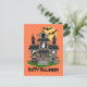 Cute Halloween haunted house and little witch postcard, featuring a haunted house with cute ghosts, bats, black cats and a little witch on orange background.