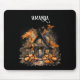 Mousepad with a cool and spooky illustration of a wooden haunted house. Surrounded by big orange pumpkins and trees with orange leaves. Windows with orange lights add a nice glow. Fun Halloween design.