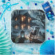 A ghostly figure sits in a rocking chair holding a drink amidst a foggy graveyard in front of a Victorian-style house.