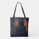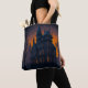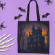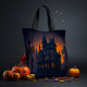 Halloween Haunted Mansion Tote Bag-featuring a spooky haunted house surrounded by twisted trees and an eerie atmosphere. This product is part of our Adult Halloween Haunted Mansion Costume Party Collection. The haunted mansion theme is found throughout this collection and is sure to intrigue you or your guests. See our collection for the rest of the coordinating products and invitation suite.