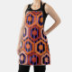 This apron has a geometric design of hexagons in four shades of orange on a field of black and purple stripes.