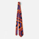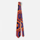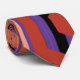 This tie has a geometric design of hexagons in four shades of orange on a field of black and purple stripes.