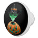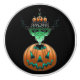 Halloween Horror Punk pop culture fantasy art green zombie monster with Jack o Lanterns, pumpkins, and black cat wearing a skull mask.