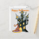 Fun watercolor Halloween design features haunted Halloween house with striped witches' hat and raven silhouette.