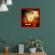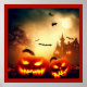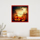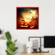 The scene is set in a dark forest with a full moon in the background. The main focus of the image is two large jack-o-lanterns with evil grins, sitting on the ground with dead leaves scattered around them. In the background, there is a haunted castle with bats flying around it. The colour scheme of the image is predominantly orange and black.