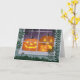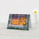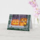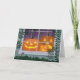 This festive folded card features a charming scene of glowing jack-o'-lanterns peeking through a window, set against a backdrop of eerie moonlight and autumn leaves. Perfect for sending Halloween wishes.