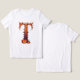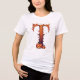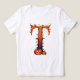 This is a festive, spooky illustration featuring an ornate, glowing orange letter 'T' that looks like an ancient, horned pillar, decorated with autumn leaves and vines. It is centred above two glowing, grinning jack-o'-lanterns nestled in a pile of fallen leaves against a dark, hazy teal background.