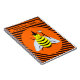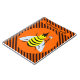 The background is a pattern of orange and black stripes.
