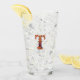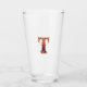 This is a festive, spooky illustration featuring an ornate, glowing orange letter 'T' that looks like an ancient, horned pillar, decorated with autumn leaves and vines. It is centred above two glowing, grinning jack-o'-lanterns nestled in a pile of fallen leaves against a dark, hazy teal background.