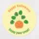 This awesome set of Halloween Party Favour labels features a digital art image of a series of leaves from a houseplant called a Monstera, also known as the Swiss Cheese Plant. The leaves are dark green and lobed and some have holes in them. The plant is contained inside a scary orange looking Halloween pumpkin with a wicked grin, sharp teeth and evil eyes. There is custom text so you can personalise this design with your own message.